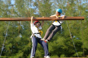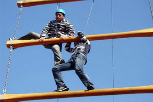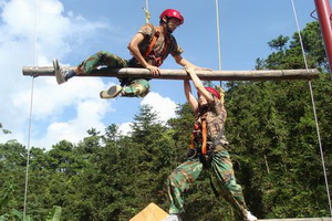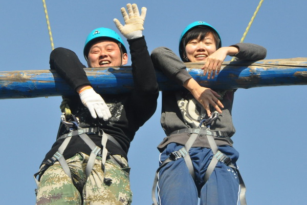 从队中选出两名队员,先穿上保险绳,同时站在云梯的一边,两位队员相互协助并运用各种方式登上共 5 层的云梯。到达之后按要求抓住胸前的绳索,由教练将其放下。
