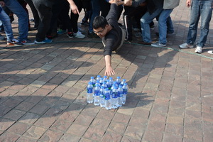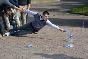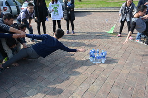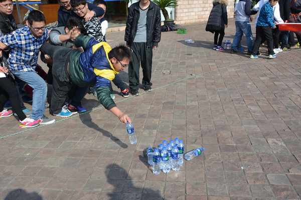 小组成员在同伴的帮助下,依次从距离端线约2米的地方取到活动的饮用水,每人仅限取一瓶,起始线至水源区为危险区,所有伙伴身体的任何一部分均不可以触碰危险区,